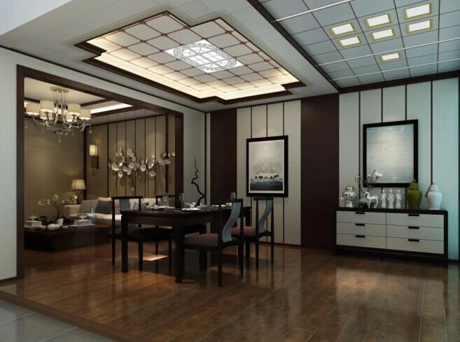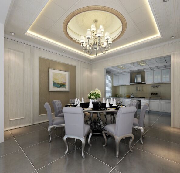 餐廳整體顏色勻而不亂,既沒有像純色吊頂那樣枯燥、單調,也沒有過分繁復、夸張,設計師在原本純色的吊頂上添置了一些花紋圖案,這些花紋在燈光的渲染下,極致典雅。圓形吊頂凹進去的部分邊緣和四周都留有光源,圓形頂中間掛有燈飾,如此充足的頂部光線并不會讓深色的餐桌顯的沉悶沒有活力。