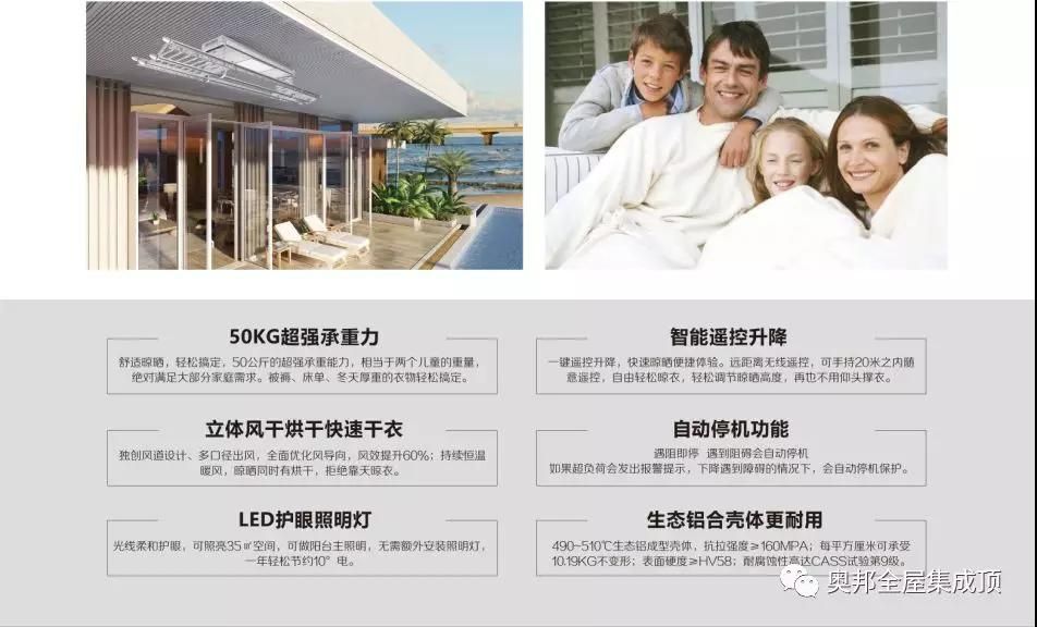 奧邦智能電動晾衣機解決傳統晾曬諸多問題,例如占用空間、晾曬費力、不夠曬、滋生細菌等這些令人頭疼的問題,為家庭舒適、健康帶來福利。